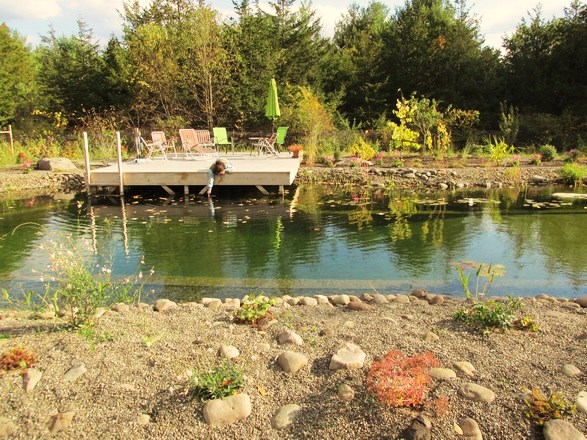 It should be noted that there are some aesthetic differences between a natural swimming pool and a chemically treated pool. Because the water is not sterilized, a brownish to greenish patina of biofilm will develop on the walls and gravel, and normally the water will maintain a very slight brownish to greenish tinge due to a small and healthy level of phytoplankton and natural tannins. Both of these conditions are part of a healthy functioning ecosystem and desirable for the role they play in keeping the system in balance. This is very similar to what you would experience from swimming in a clean lake. If you are comfortable with that then a natural pool should be comfortable for you, but if you feel more comfortable with bleached white concrete, a traditional pool may be more to your liking.